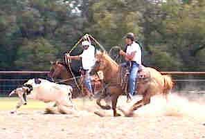 | Countryboy Captain 14 yr. old, AQHA, chestnut gelding. 15-2 hands, 1225#, head horse. A great amateur rodeo horse. Quick speed, likes to go left, great move in the corner and easy to rope from and easy to heel behind. $7,500 | |