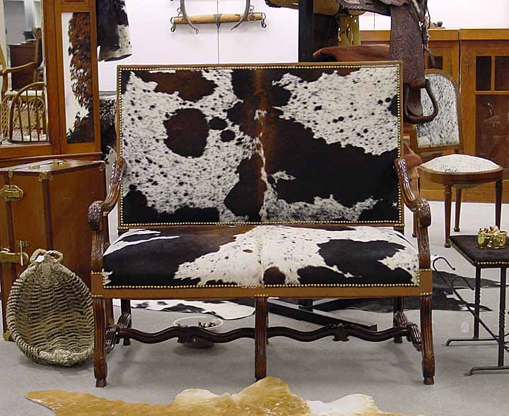 Century Settee upholstered with tri-colored steer-hide, brass nailed
